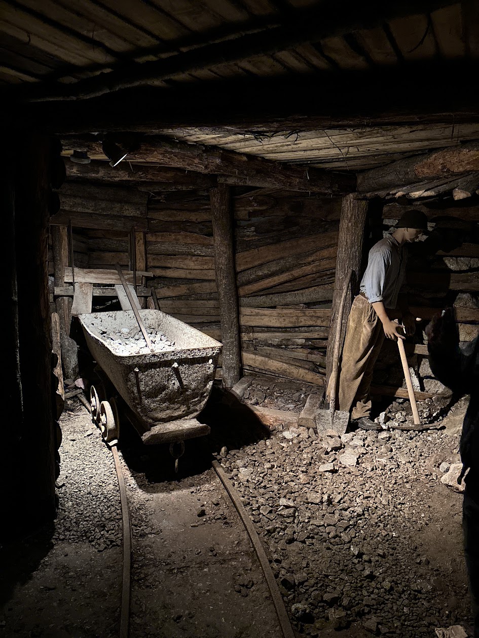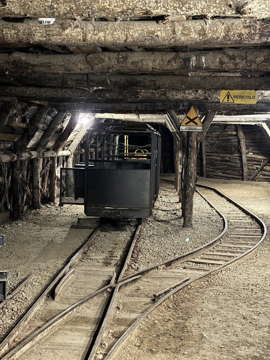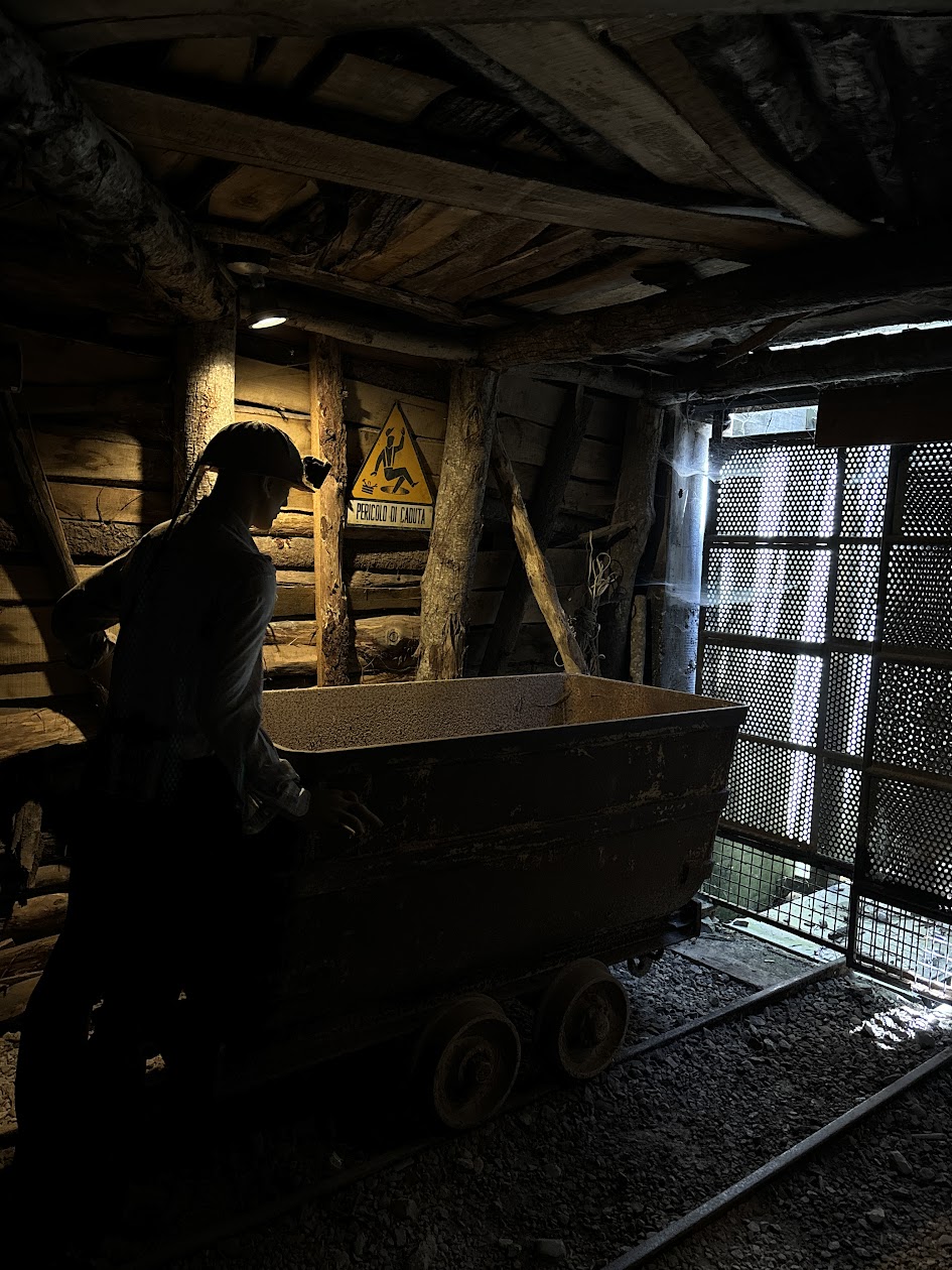 Uno degli aspetti più suggestivi è la possibilità di scendere nelle gallerie sotterranee, oggi perfettamente messe in sicurezza. A bordo di un piccolo trenino minerario si percorre un tratto della galleria principale, tra pareti rocciose e ambienti che conservano ancora l’atmosfera autentica del lavoro in miniera. Il buio, l’umidità e l’eco dei passi ricreano con forza le sensazioni di chi trascorreva lì gran parte della propria vita.